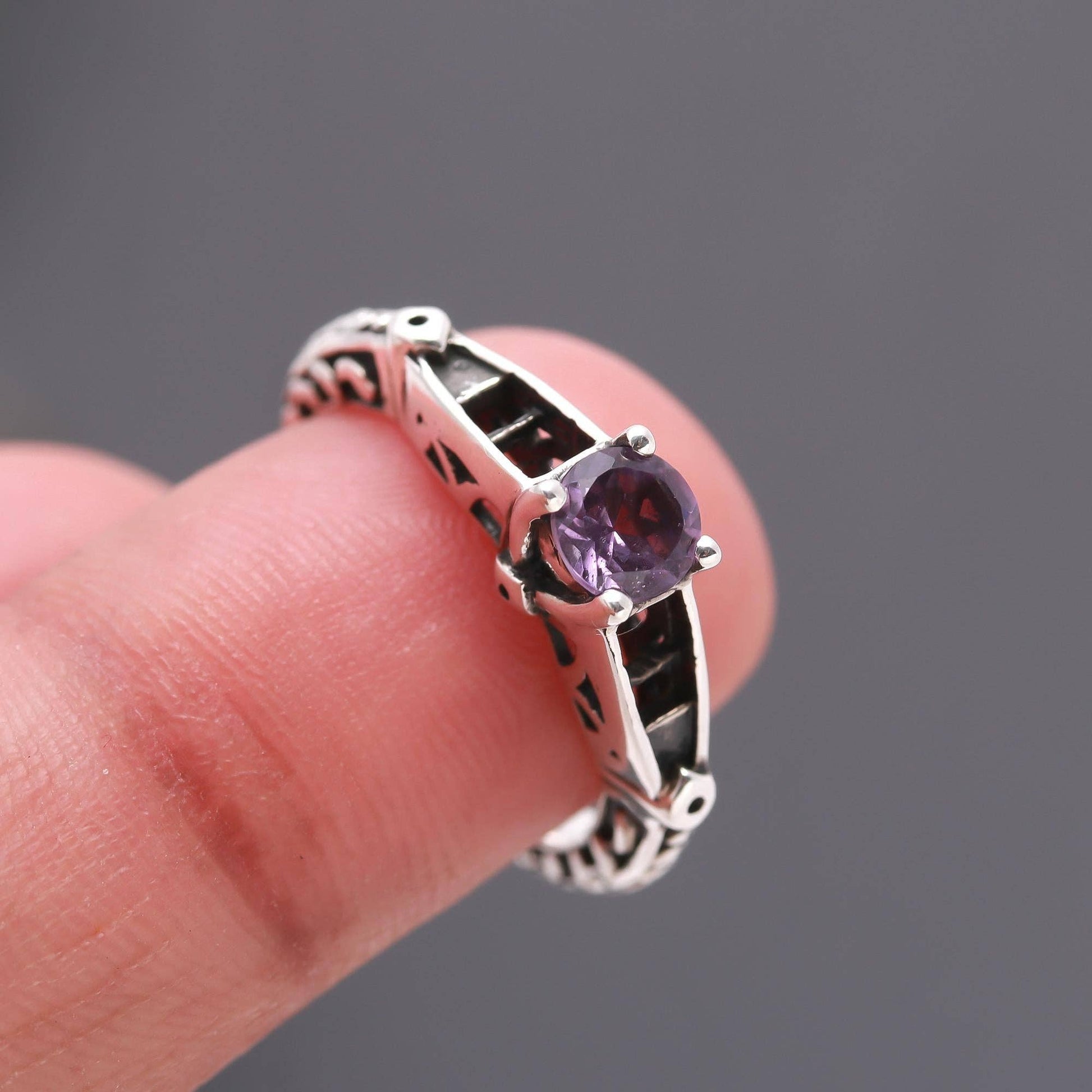 Step into timeless charm with this vintage-inspired 925 sterling silver ring, beautifully designed with a round-cut amethyst at its heart. The rich purple gemstone glows softly, nestled in a prong setting that allows maximum light to pass through. The band features intricate antique-style engravings and openwork details, adding depth and a handcrafted feel.
