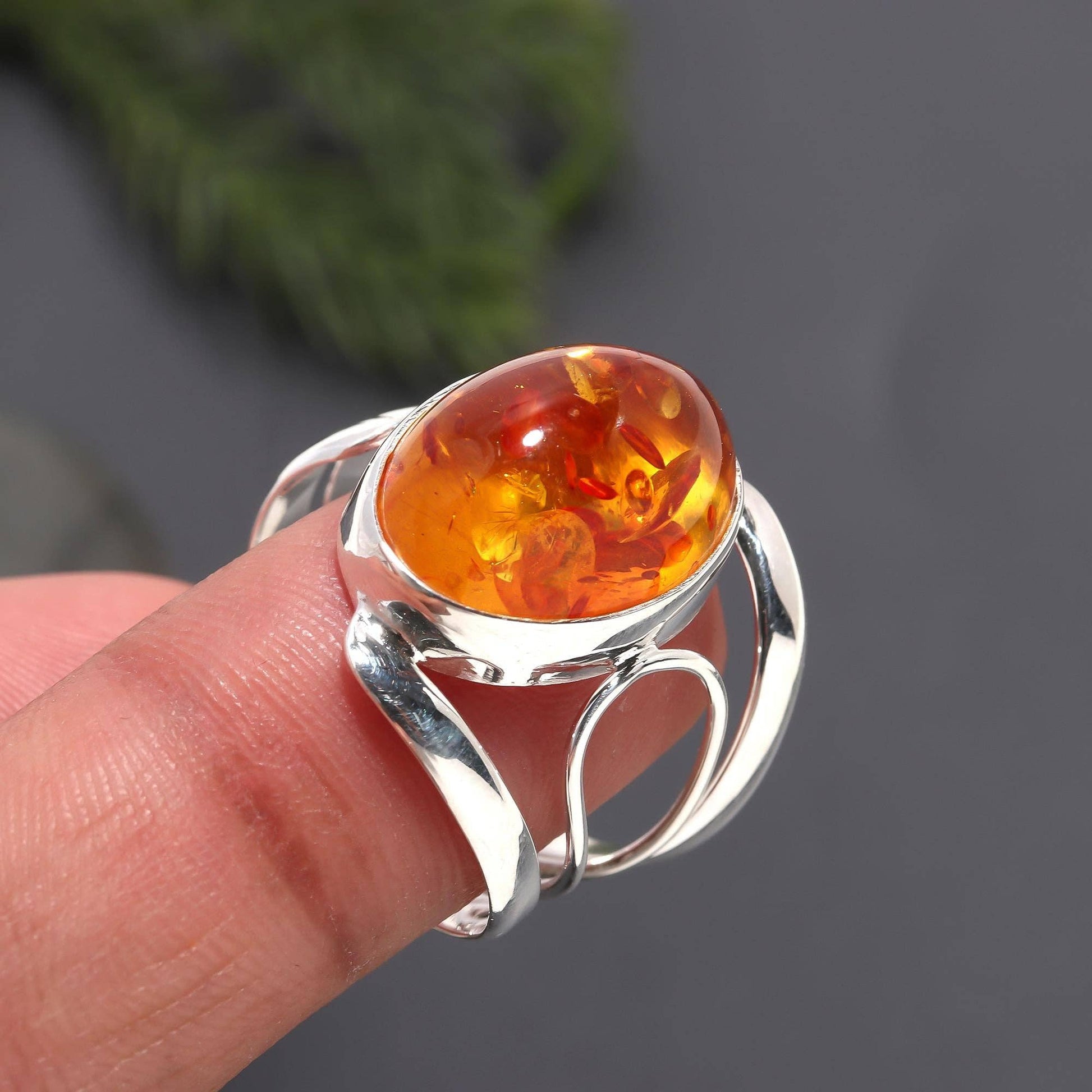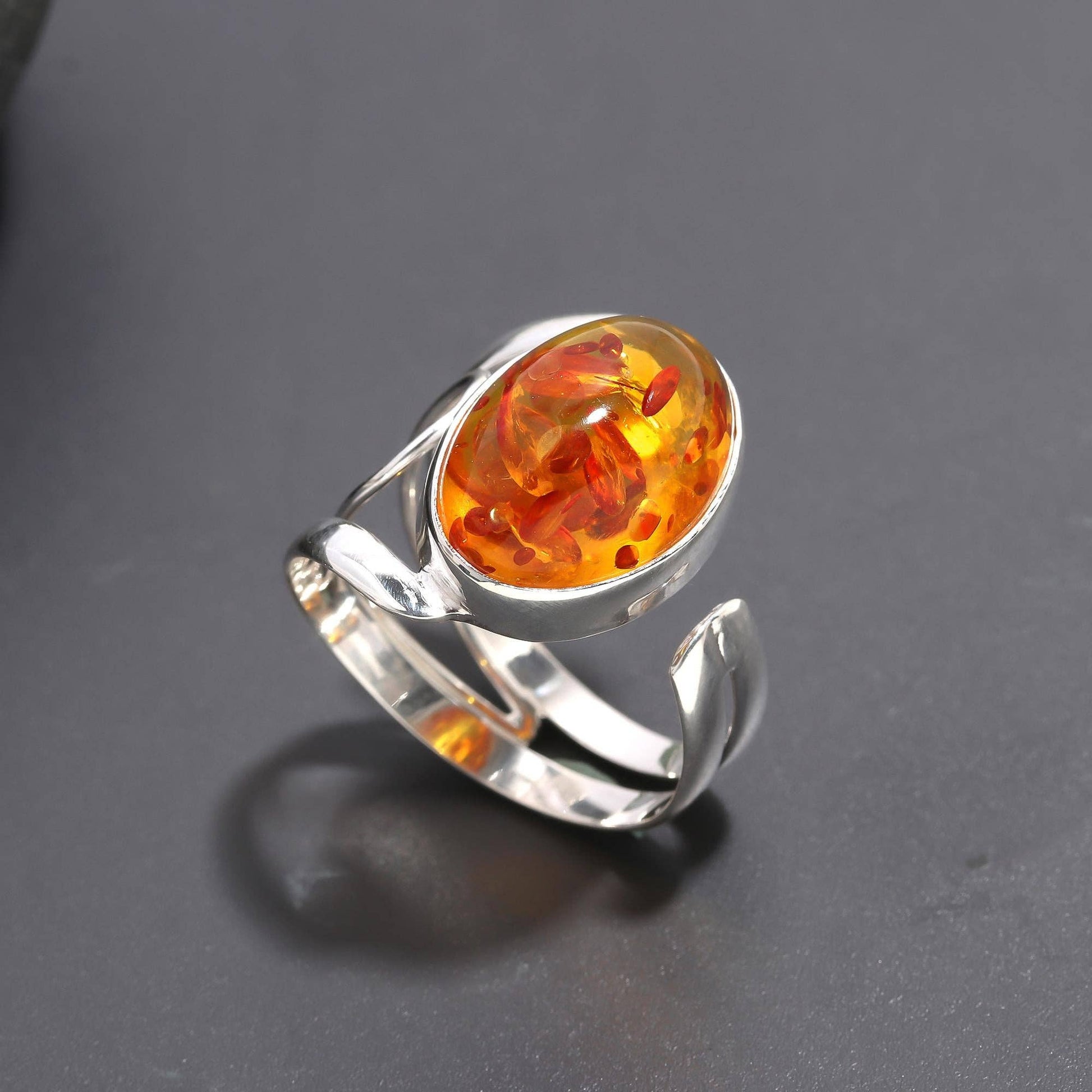 Glowing with warm golden-orange tones, this sterling silver ring features a captivating oval amber gemstone set in a sculptural open band. The translucent amber reveals fiery inclusions that shimmer like trapped sunlight, making each piece one of a kind. The organic swirls of the silver band flow around the stone like dancing flames, giving the ring a fluid, artistic feel.