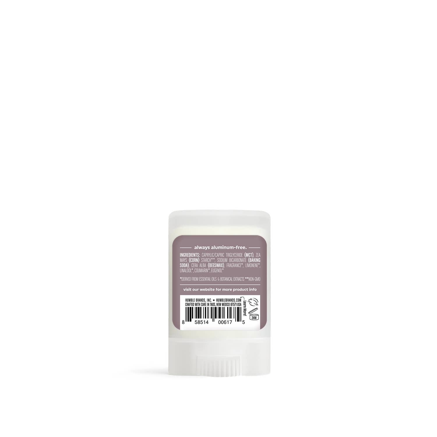 Product Description: Made with simple, highly effective ingredients (MCT oil, non-GMO corn starch, beeswax, baking soda and botanically-based scents). Humble Brands Deodorant is formulated to absorb and neutralize body odor. Humble Brands Deodorant has no aluminum, alcohol, dyes, parabens, sulfates or artificial fragrance. Certified Cruelty-Free by Leaping Bunny and a 1% for the Planet product that gives back with every purchase. Full size deodorant containers are made from 75% post consumer recycled plastic.