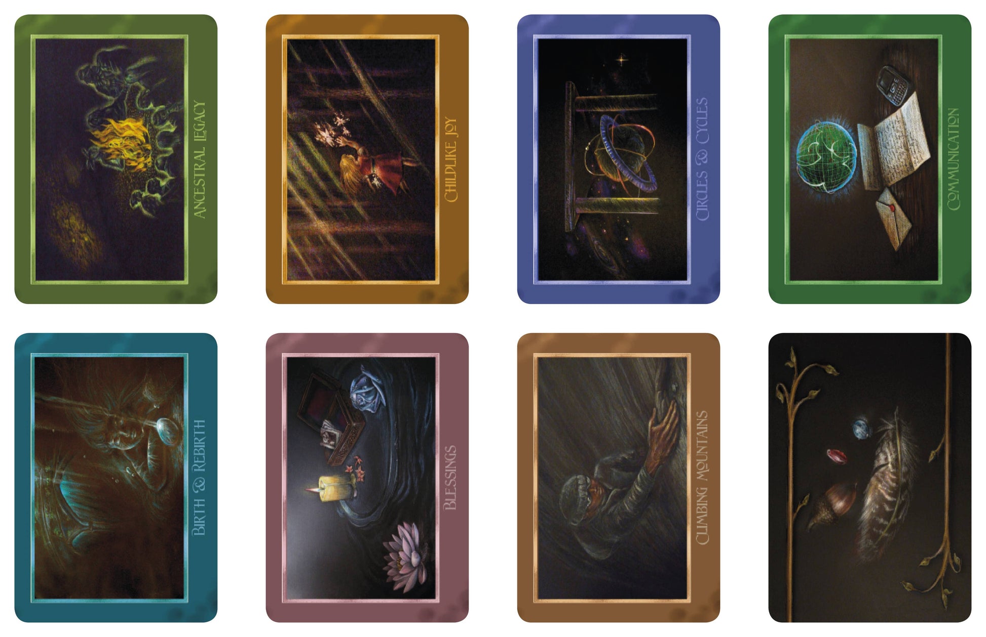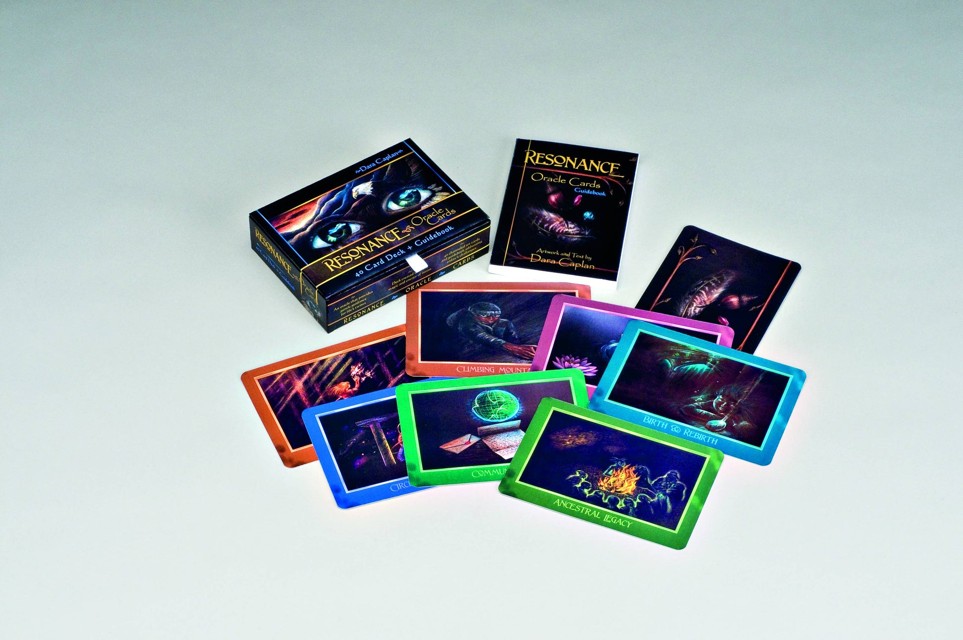 Find answers for all your deepest questions including the emotional, mental, and spiritual guidance allowing you to find your own path of joy, peace, balance, and wisdom. Messages also embrace nuances of physical reality, such as technology and lines of communication. Author/artist Dara Caplan channeled the messages and art, and includes the power of intent in order to give you the best experience possible. The images and meanings do not discriminate between gender or type; the animals, magical beings, people, and plants of this world are all honored as special beings in the artwork. The 40 beautiful images reflect life's truths there are some cards that are surreal and dream-like, and some that are romantic or dramatic. While each is different, they all are on black backgrounds, and have warmth and light to balance the shadows and the warmth of memories, or soft light of new beginnings.