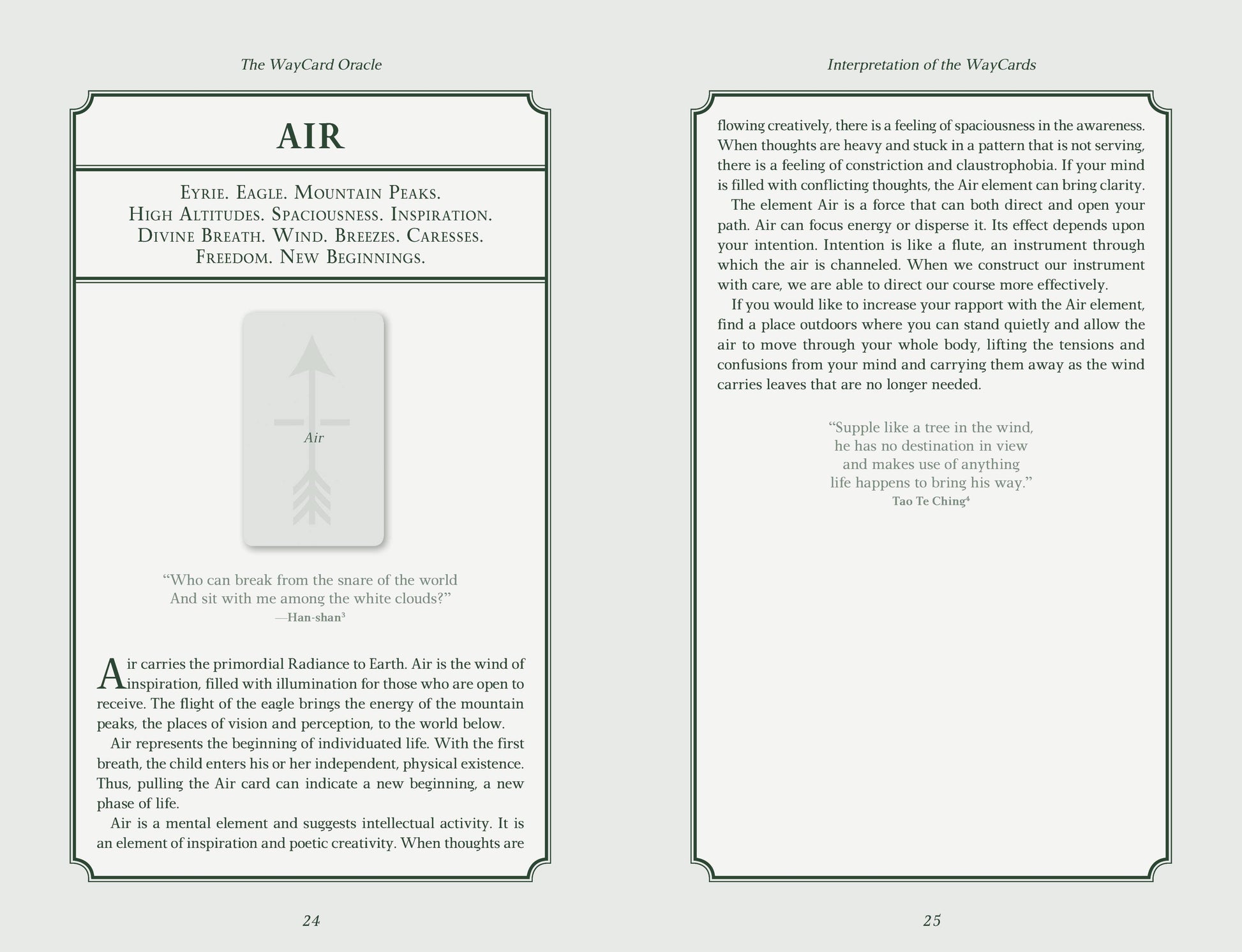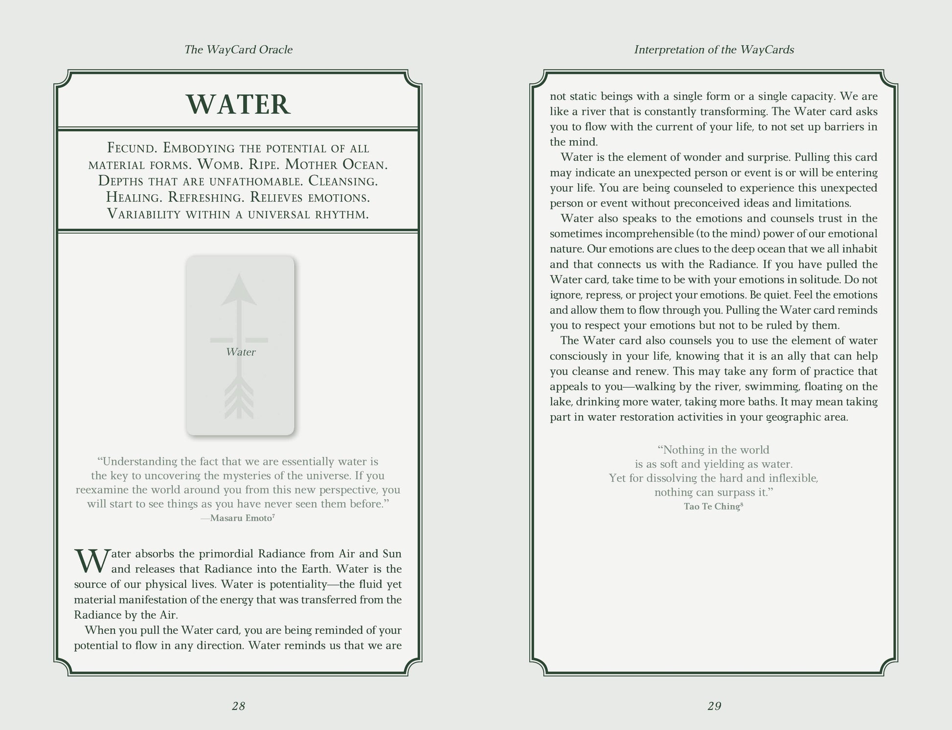 Find your "Way" with 33 oracle cards with guidebook based on principles of the ancient traditions of Taoism and nature-based spirituality. Organized around basic archetypal situations of life and shown with Way-pointing Arrows on each card, varied themes—Child, Nest, Hero, Crossroads, Threshold, Betrayal, Earth, Air, Fire, and Water reflect your journey, the elemental forces of life, and the fundamental situations you may find yourself encountering along the Way. With this deck, first see what lies outside you with clarity, and then explore what lies inside. Places and encounters along your life path can identify hidden knowledge, challenges, and opportunities and the passage to the interior mingles both negative and positive emotional experiences each illuminating the Way.