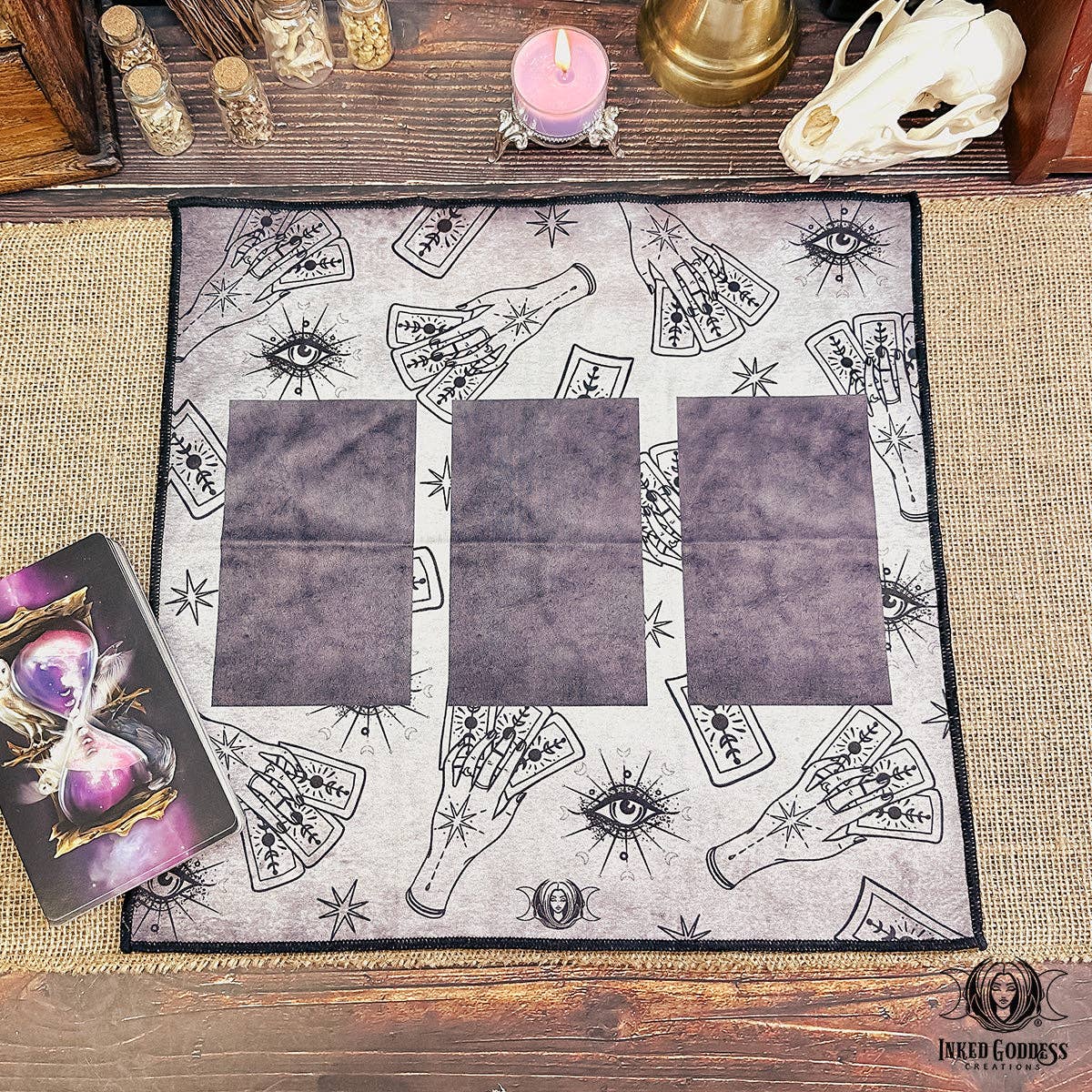 Prepare your altar for a card reading with the Three Card Spread Altar Cloth, exclusive to Inked Goddess Creations.