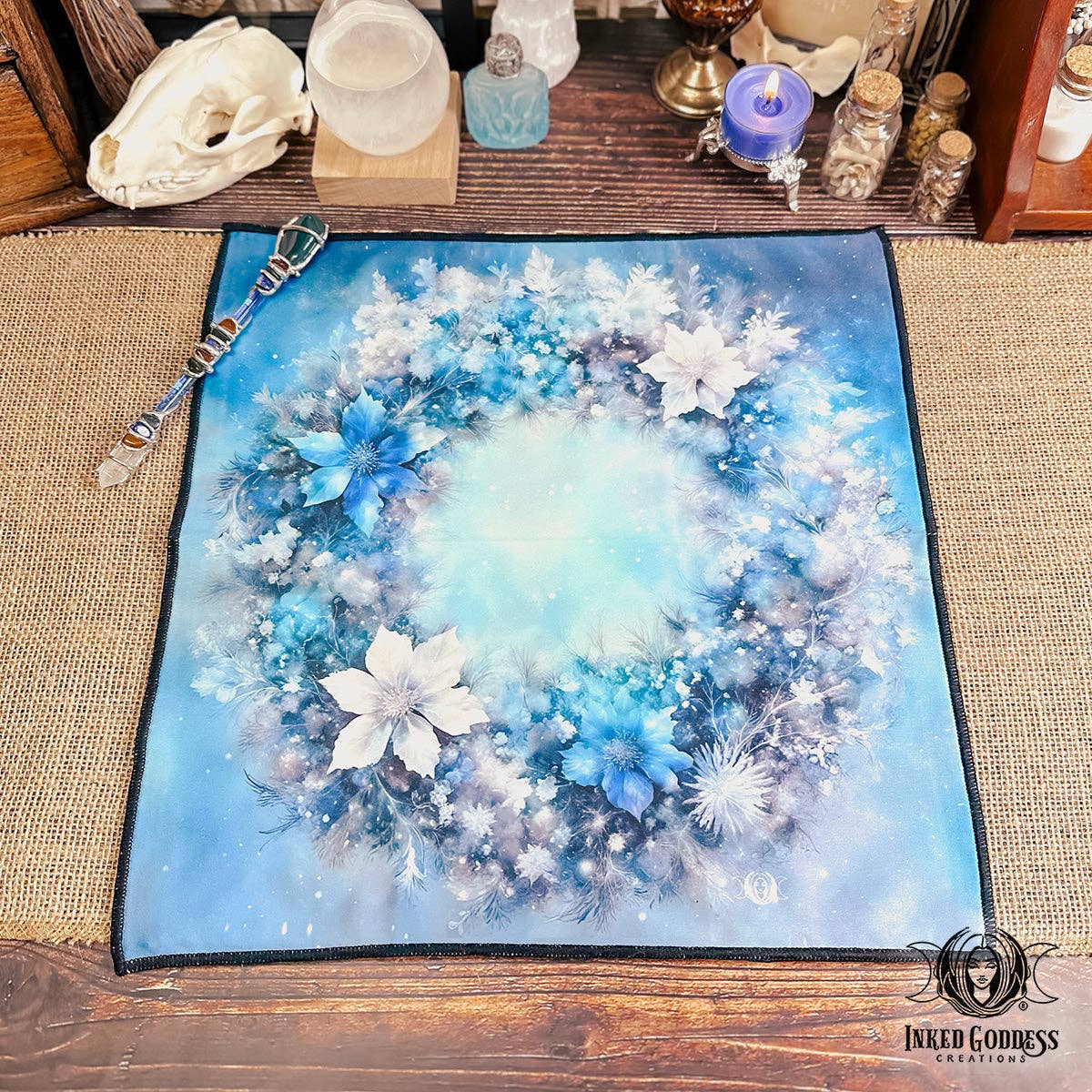 The Winter Altar Cloth is 12" square, designed by Morgan, owner of Inked Goddess Creations. It depicts a wintery wreath made of blue and white flowers and snowflakes.